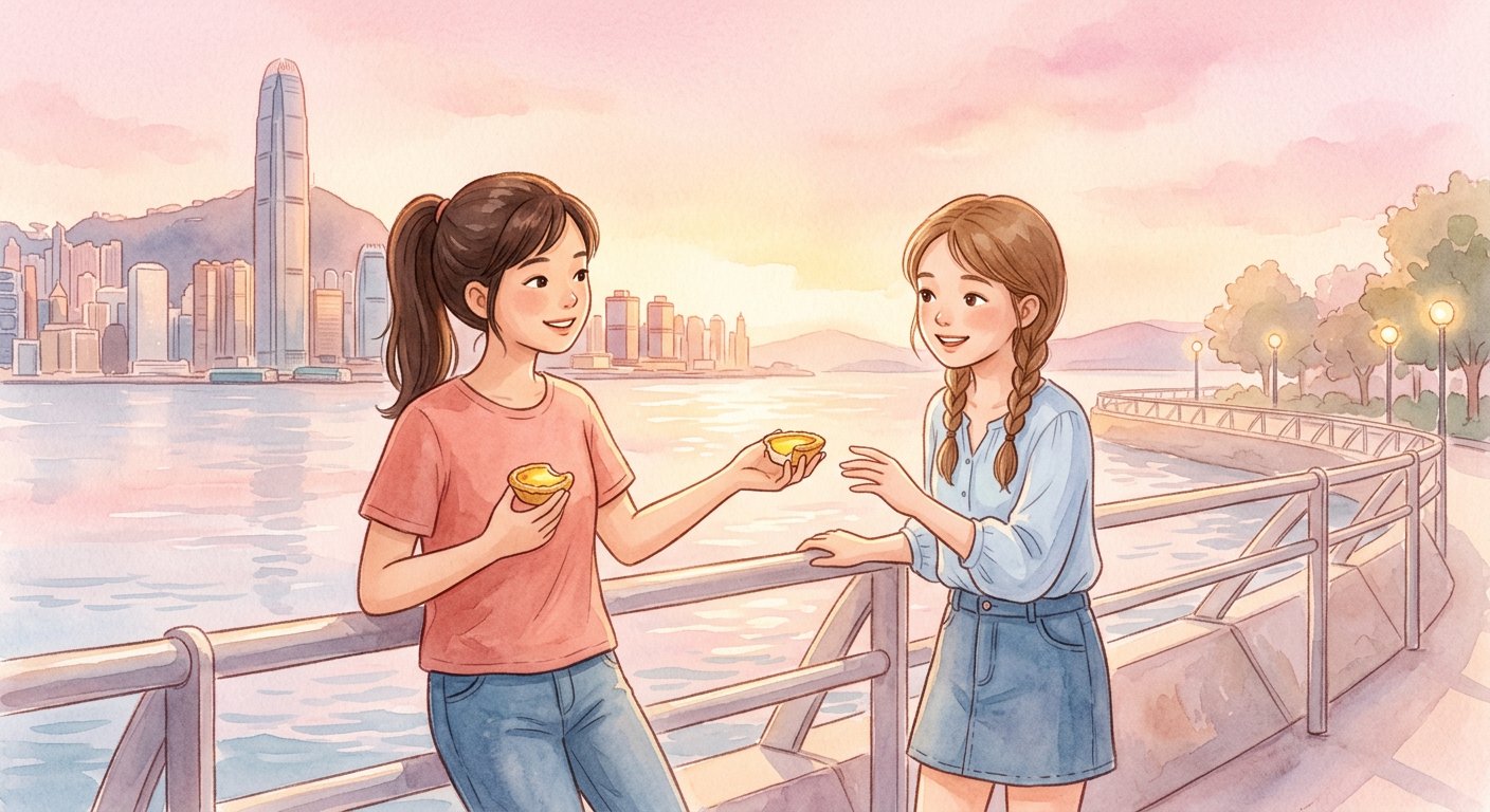 兩個女孩肩並肩靠在欄杆上,一邊看着對岸的高樓,一邊分享一個蛋撻。