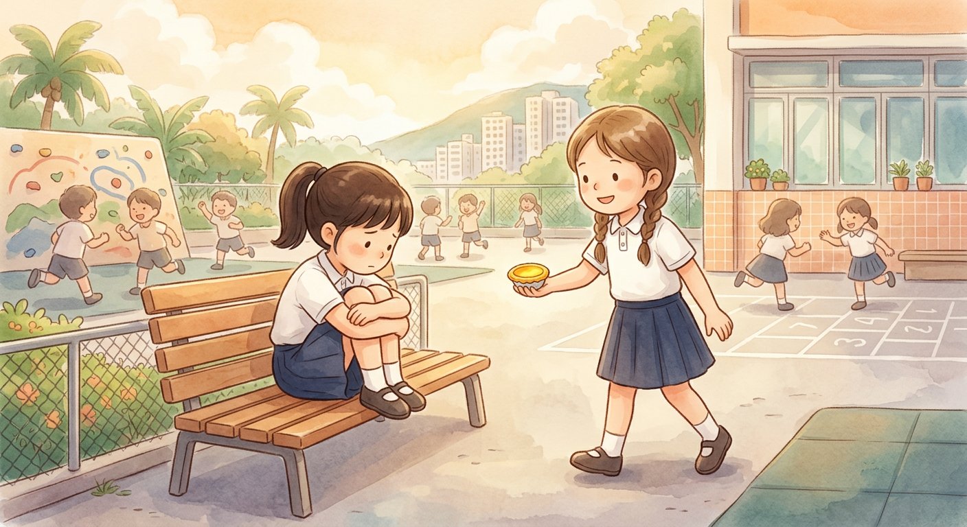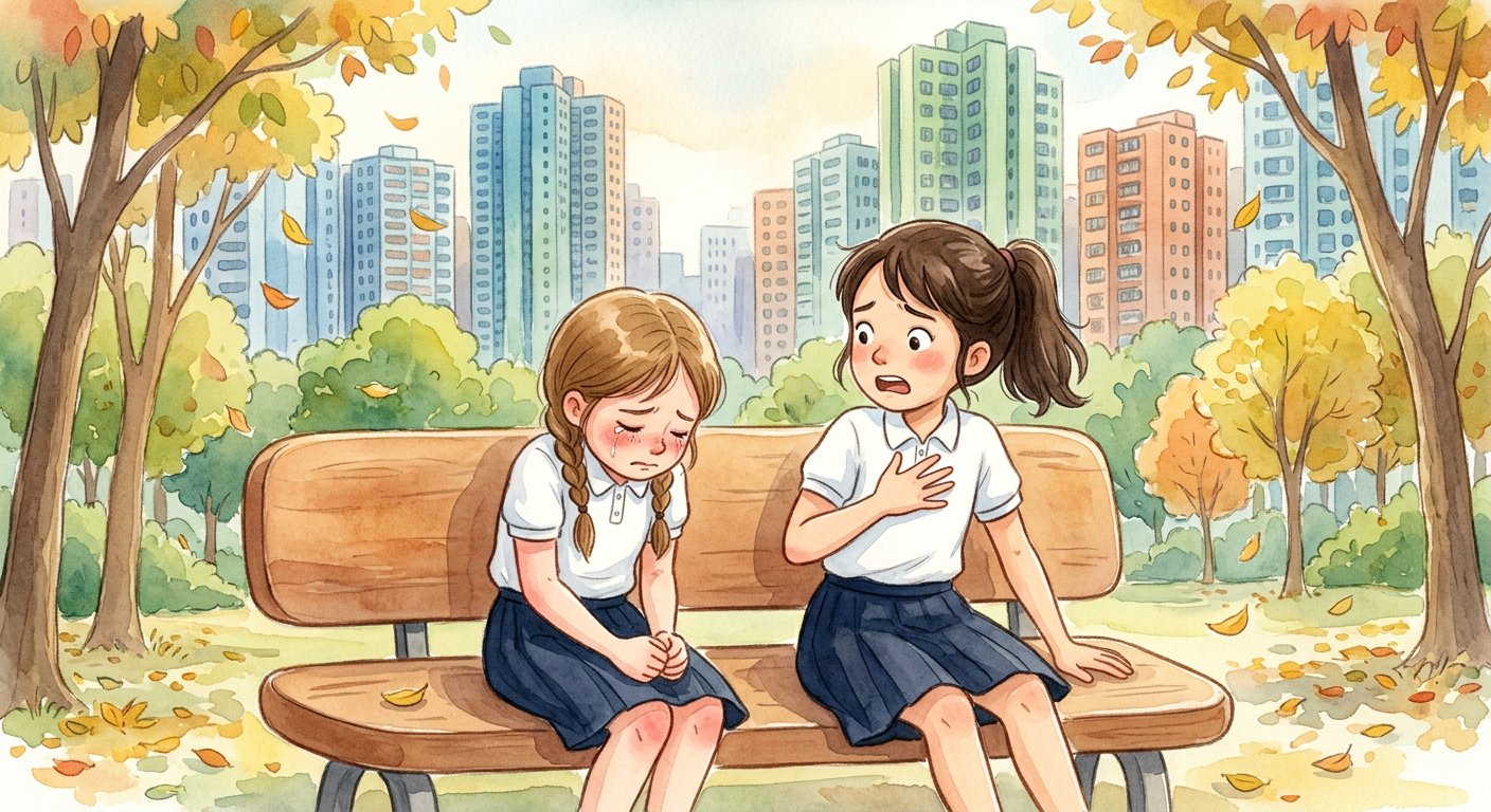 一個秋天的下午,小晴低着頭坐在公園的長椅上,眼眶紅紅的。