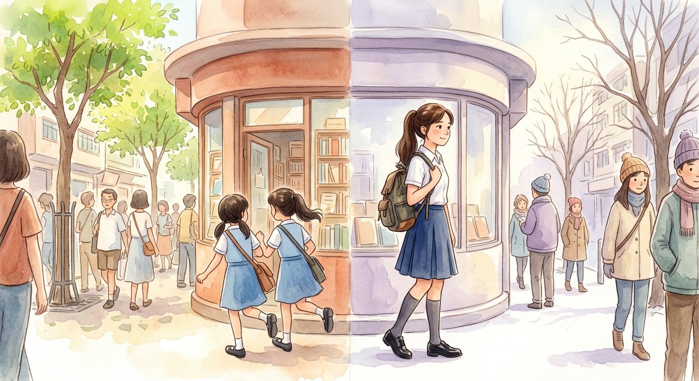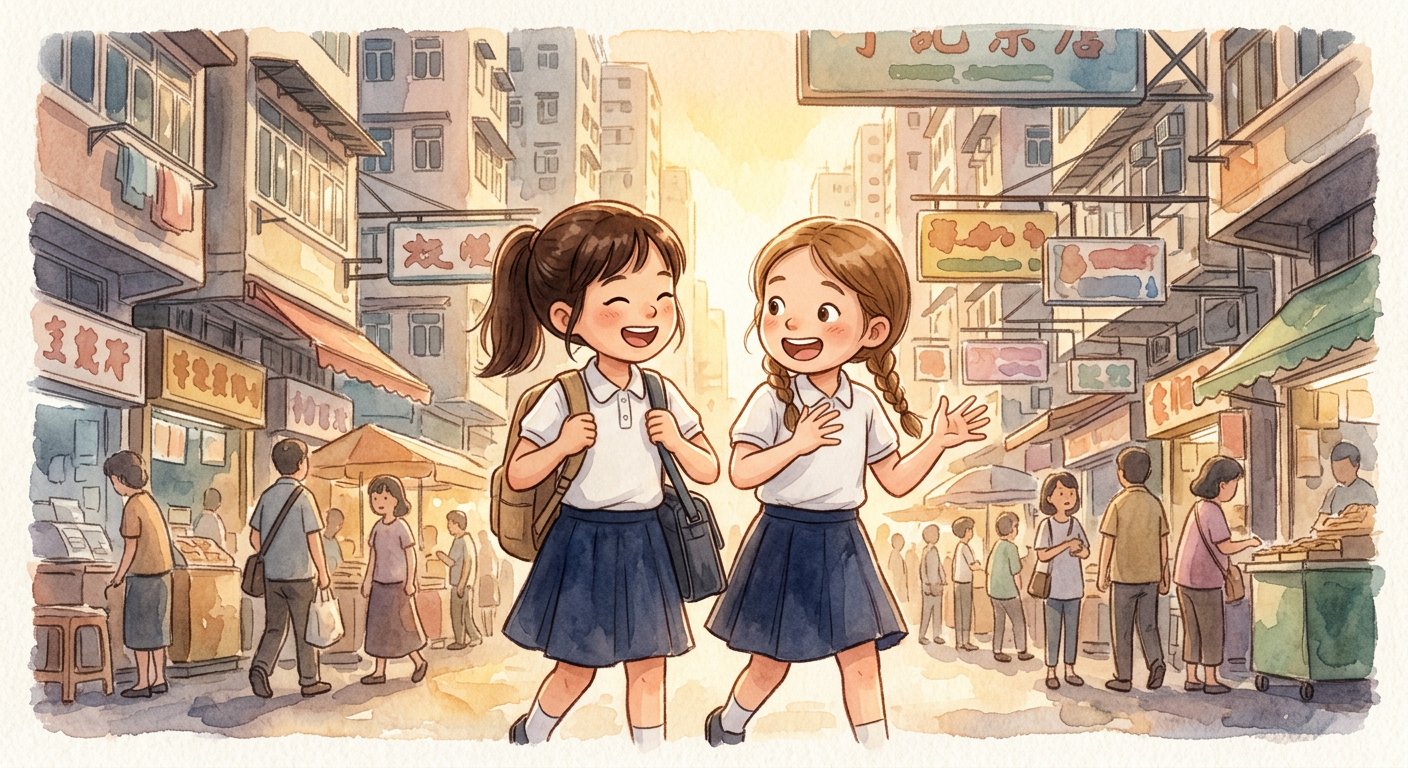 放學後,兩人肩並肩走過熱鬧的街道,一邊笑、一邊聊天。小雅幫小晴拿書包,小晴比手畫腳地講故事。