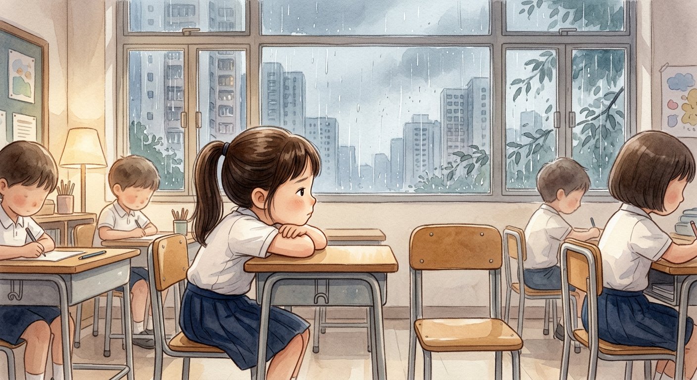 窗外下着雨,小雅趴在桌上,一直看着旁邊那張空椅子。